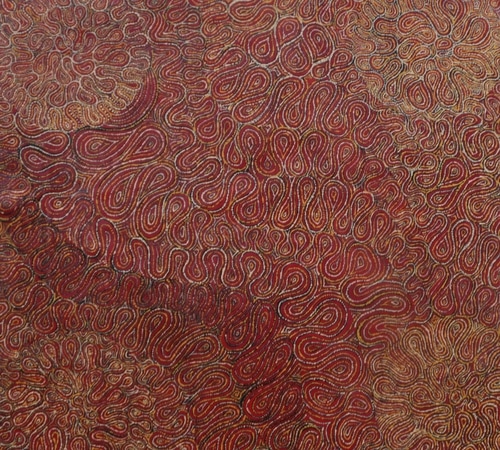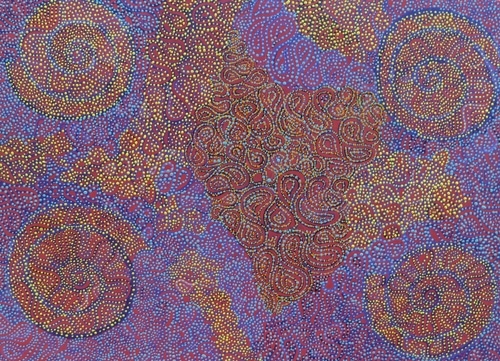 Janice Sandy is a Yindjibarndi artist from Roebourne. Part of the Stolen Generation, she was taken as a baby to a hostel in Perth and wasn't able to return to her Country until 1982 at the age of 12. Janice began painting in 2006 and is the youngest sister of prominent Yinjaa-Barni artists Aileen and Allery Sandy. She uses sponges and varied brush sizes to create patterns on canvas. Janice has exhibited in the Pilbara, Perth and Sydney. She now lives in Karratha with her husband and family.