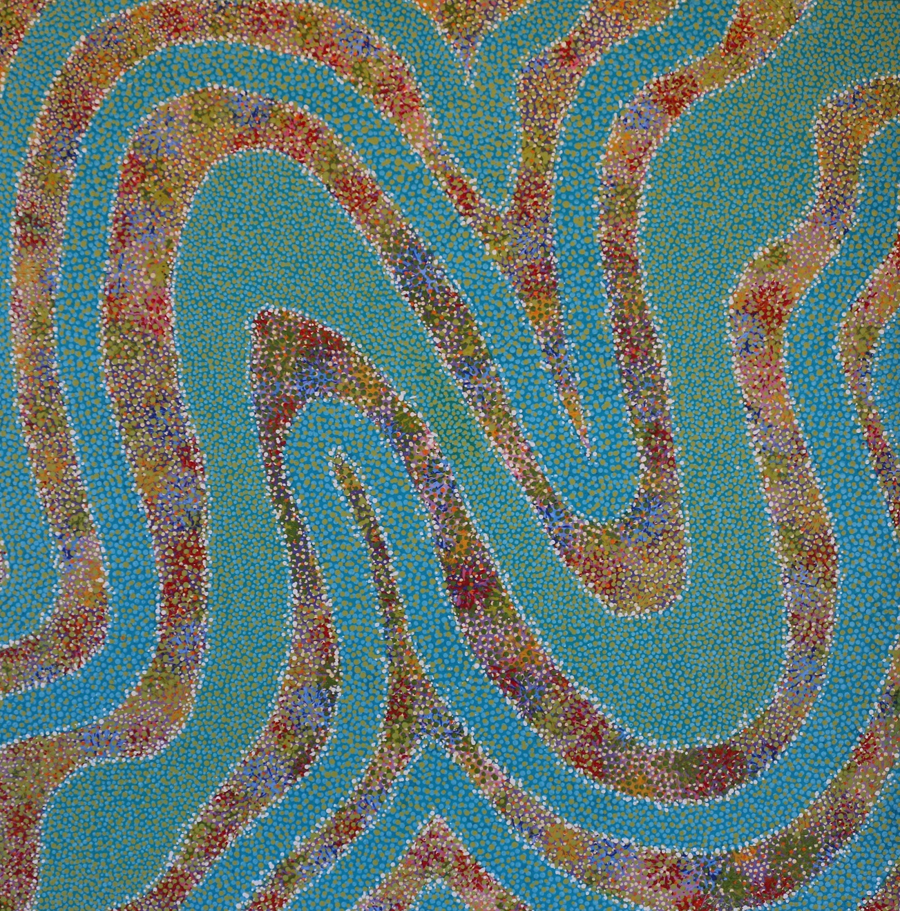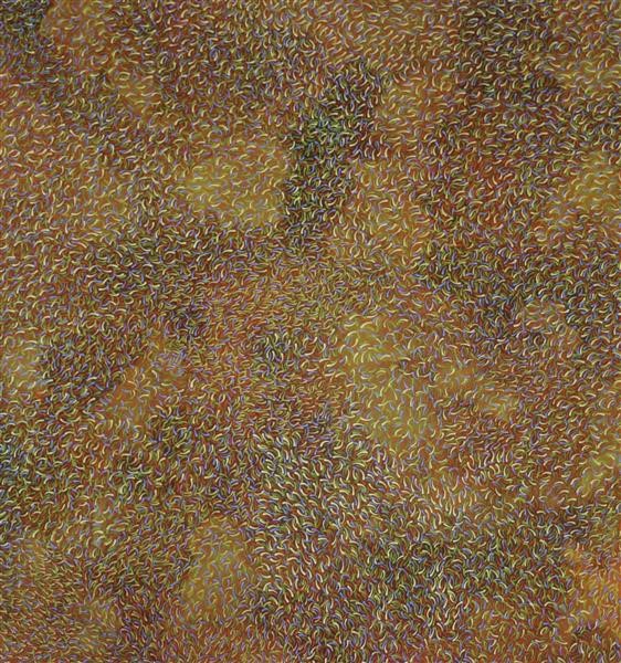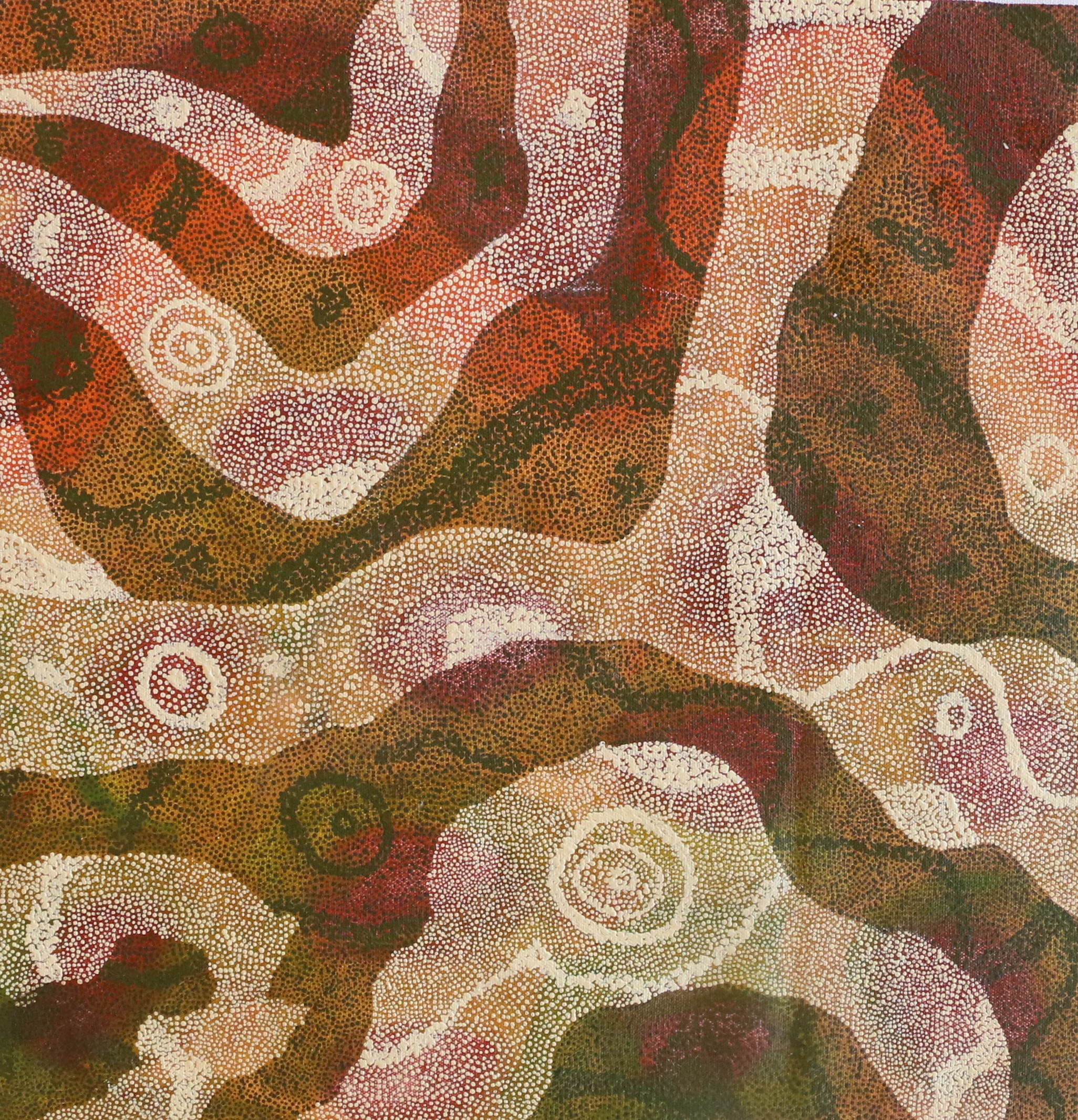 Justina Willis is a Yindjibarndi artist who was born in Leigh Creek, South Australia and is now based in Roebourne. Her mother's country is the Millstream Tablelandss and her father is from Adelaide. Justina is the sister of fellow Yinjaa-Barni artist Melissa Sandy and began painting in 2006. She paints the Country in a unique, meticulously planned style to achieve the effect and composition she desires, using fine brush strokes and dot work over an abstract underlayer of rich colours that are inspired by the Pilbara. While the bush and the colours of the Country provide the inspiration for Justina's paintings, she also experiments with optical colour mixing to create a third dimension within her work. Justina has exhibited her artworks in the Pilbara and Perth. She has also won several awards, including Cossack Art Awards for Best Art Work Pilbara Artist (2013), Emerging Indigenous Artist Prize (2008 and 2010) and the Flora and Fauna Prize (2019).