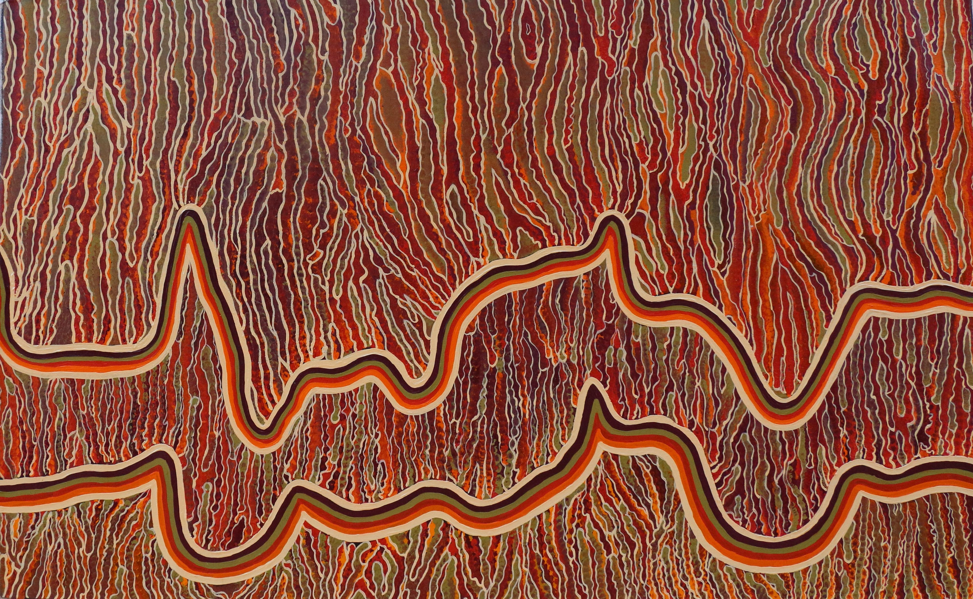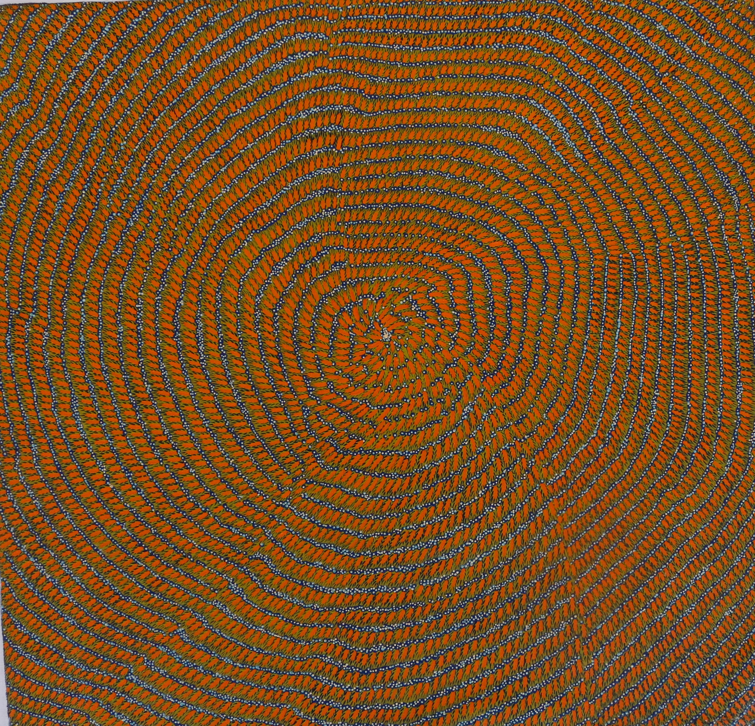 A Yindjibarndi elder and founding member of one of the region's first art groups, Bujinhurrba, Maudie Jerrold is part of the backbone of Pilbara Aboriginal art. Born in Hooley Creek near Wittenoom and raised in Roebourne, Maudie has witnessed and helped guide her community through dramatic lifestyle changes. Maudie's colourful and intricately patterned artwork relates to the landscapes of Yindjibarndi and Ngarluma Country of the Pilbara, paying specific attention to the flora of the area and often depicting plants or flowers that have a medicinal or ceremonial purpose. In 2006 Maudie was selected to visit Florence, Italy as part of Antica Terra Pulsante, an exhibition showcasing art from the Pilbara. In 2007 she became a member Yinjaa-Barni Art, bringing to the group her cultural knowledge and painting experience. Maudie is represented in both public and private collections in Australia and internationally and has won prizes at the Cossack Art Awards, including Best Artwork by Western Australian Aboriginal Artist (2009 and 2012). Her work has been exhibited in the Pilbara, Perth, Sydney, Singapore, Italy and Spain and has been acquired by the Art Gallery of Western Australia (2015).
